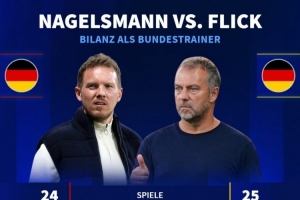 截止昨天的比賽,納格爾斯曼已經(jīng)執(zhí)教德國隊(duì)24場比賽,戰(zhàn)績?yōu)?2勝6平6負(fù)20個凈勝球。而弗里克從2021-2023年總計執(zhí)教德國隊(duì)25場,戰(zhàn)績?yōu)?2勝7平6負(fù)30個凈勝球。