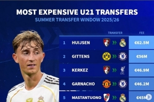 體育資訊9月5日訊 《轉(zhuǎn)會市場》統(tǒng)計了今夏的U21球員最貴轉(zhuǎn)會費榜單,皇馬6250萬簽下赫伊森居首。