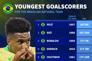 德轉(zhuǎn)列巴西隊(duì)史最年輕進(jìn)球者: