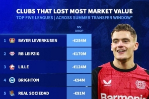 體育資訊9月5日訊 2025年五大聯賽的夏窗已經落下帷幕,德國轉會市場統計了在夏窗過后,全隊身價跌幅最多的球隊排行榜。