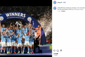 哈蘭德曬出了京多安作為隊(duì)長捧起隊(duì)史首座歐冠獎(jiǎng)杯的照片,并配文:“始終以身作則,真正鼓舞大家。祝你一切順利,Gundo(對(duì)京多安的昵稱)!”