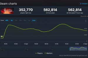 體育資訊9月6日訊?萬眾矚目的類銀河戰(zhàn)士惡魔城游戲《空洞騎士:絲之歌》已于9月4日正式發(fā)售,根據(jù)SteamDB數(shù)據(jù)顯示,截止今日10點(diǎn),《絲之歌》在Steam平臺的在線人數(shù)峰值再創(chuàng)新高,現(xiàn)已超越56萬人!