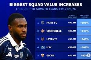 體育資訊9月7日訊 《轉(zhuǎn)會市場》統(tǒng)計了今夏轉(zhuǎn)會窗過后的總身價上升比例情況,多家升班馬霸榜。