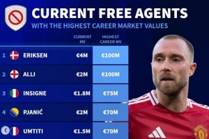 體育資訊9月7日訊 主流聯(lián)賽的夏窗已經(jīng)關(guān)閉,《轉(zhuǎn)會市場》統(tǒng)計了當前仍為自由身的球員歷史身價榜,埃里克森和阿里并列居首。