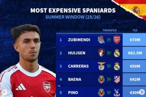 體育資訊9月8日訊 今夏主流聯(lián)賽轉(zhuǎn)會窗已經(jīng)關(guān)閉,《轉(zhuǎn)會市場》也列出了西班牙球員的今夏轉(zhuǎn)會費最貴情況。
