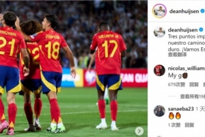 赫伊森社媒曬出比賽照片,配文:“開啟世預(yù)賽征程的重要三分,讓我們繼續(xù)努力,加油西班牙!”
