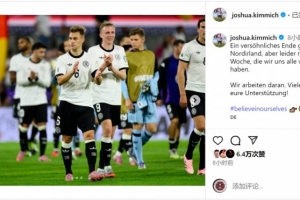 基米希社媒曬出賽后謝場的照片,并寫道:“對陣北愛爾蘭的比賽取得了不錯的結果,但遺憾的是,這樣的一周并不是我們所有人期待的。我們正在努力。非常感謝大家的支持!”