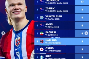 6.哈蘭德(挪威),vs摩爾多瓦(2025),5球