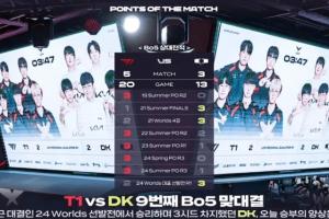 體育資訊9月10日訊 今日,LCK季后賽將迎來DK對陣T1的比賽,賽前官方直播間給出T1 vs DK歷史BO5交手記錄:T1大場5勝3負,小場20勝13負,具體戰(zhàn)績?nèi)鐖D。