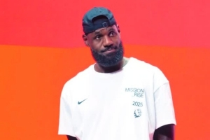 在活動(dòng)臨近結(jié)束時(shí),一位激動(dòng)的男球迷沖上舞臺(tái)試圖接近詹姆斯,被主持人和安保阻攔。期間,詹姆斯顯得十分淡定,沒(méi)有任何反應(yīng)。在該沖動(dòng)球迷被帶下舞臺(tái)后,詹姆斯無(wú)奈地?fù)u頭笑了笑。