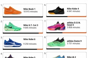 其中布克的簽名鞋Book 1排名第一、共計上場時長10915分鐘。而科比的三代球鞋也都有上榜,還有利拉德、米切爾以及莫蘭特的簽名鞋。