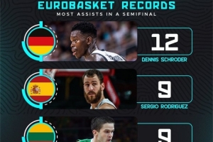 根據(jù)數(shù)據(jù)統(tǒng)計,施羅德此役送出12次助攻,這是歐錦賽半決賽歷史紀錄。此前的紀錄保持者是西班牙球員塞爾吉奧-羅德里格斯和立陶宛球員曼塔斯-卡尼提斯,兩人都曾在歐錦賽半決賽上送出9次助攻。