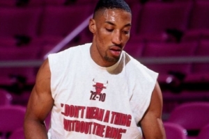 圖片中,皮蓬穿著一件紀念公牛95-96賽季常規(guī)賽取得72勝10負的運動衫,衣服上印著:沒有戒指的話,一切都沒有意義。