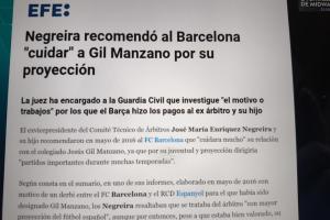 前裁判技術(shù)委員會(huì)副主席內(nèi)格雷拉及其兒子曾在2016年5月向巴薩建議應(yīng)“多加維護(hù)”與裁判赫蘇斯-曼薩諾的關(guān)系,因其年輕且有發(fā)展?jié)摿Γ拔磥?lái)多個(gè)賽季將執(zhí)法重要比賽”。
