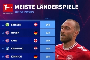 體育資訊9月14日訊 德國轉(zhuǎn)會市場列出了德甲現(xiàn)役球員國家隊出場次數(shù)榜,埃里克森144場居首,諾伊爾、凱恩二三位。