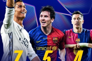 歐冠官方社媒曬出球員單賽季歐冠進(jìn)球10+的次數(shù),C羅7次、梅西5次、萊萬4次,配文:“萊萬本賽季會(huì)追平梅西嗎?”