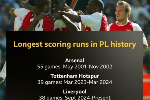 體育資訊9月15日訊 在本輪英超,利物浦1-0擊敗伯恩利,延續(xù)了球隊(duì)連續(xù)進(jìn)球場(chǎng)次紀(jì)錄。以下為英超歷史連場(chǎng)破門紀(jì)錄榜: