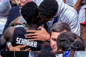 比賽賽后,同時(shí)入選最佳陣容的字母哥和施羅德?lián)肀е乱?。?duì)此,施羅德表示:“揚(yáng)尼斯做出了非常棒的舉動(dòng),他主動(dòng)來找我,說我們各自代表德國(guó)和希臘為國(guó)征戰(zhàn),而他這次也終于為希臘隊(duì)贏得了首枚大賽獎(jiǎng)牌。我對(duì)他只有敬佩——他有四個(gè)可愛的孩子、賢惠的妻子,還有始終陪伴他的兄弟,一家人都在為籃球事業(yè)努力。更不用說他在NBA賽場(chǎng)上的表現(xiàn),那完全是另一個(gè)級(jí)別的存在,絕對(duì)是世界頂尖球員之一。他主動(dòng)過來和我交流,這種舉動(dòng)充滿了體育精神,非常難得。他還說一直在看我們球隊(duì)的YouTube視頻,我覺得這種跨國(guó)家的球員互動(dòng),對(duì)希臘和德國(guó)的籃球交流也很有意義?!?/p>