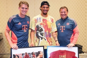 數(shù)據(jù)統(tǒng)計顯示,薩內(nèi)效力拜仁5年,共計223場正式比賽,貢獻(xiàn)61粒進(jìn)球55次助攻,隨隊贏得4次德甲冠軍。薩內(nèi)獲贈了兩件紀(jì)念品:印有數(shù)字"223"的特制球衣(紀(jì)念其為拜仁的出場次數(shù));記錄五年拜仁生涯精彩瞬間的特制海報,附題詞"謝謝你,勒魯瓦!"