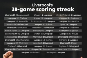 體育資訊9月16日訊 根據(jù)英超官方統(tǒng)計(jì),利物浦連續(xù)38場(chǎng)聯(lián)賽取得進(jìn)球。