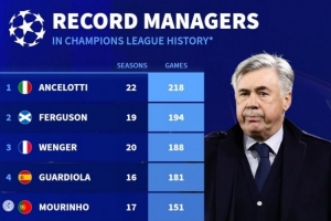 體育資訊9月16日訊 新賽季歐冠即將開打,德轉(zhuǎn)列主教練執(zhí)教歐冠場次排行,安切洛蒂218場居首,弗格森、溫格排在二三位。
