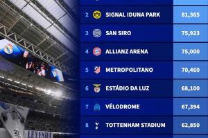 體育資訊9月18日訊 新賽季歐冠已經(jīng)重燃戰(zhàn)火,歐足聯(lián)官方盤點(diǎn)了參賽36隊(duì)10大容量最大球場(chǎng),伯納烏83186人居首。