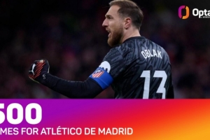 奧布拉克迎來馬競生涯500場里程碑之戰(zhàn),是俱樂部歷史首位實(shí)現(xiàn)如此成就的門將,他的出場次數(shù)僅次于科克(若本場出戰(zhàn)為688場)和阿德拉爾多(550場)。