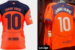 體育資訊9月19日訊 著名足球裝備網(wǎng)站FootyHeadlines報(bào)道,巴薩第三球衣身后印字因?yàn)槲骷滓?guī)定只能使用白色字體,效果看起來(lái)差多了。