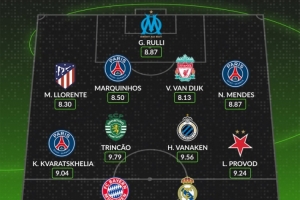 后衛(wèi):略倫特(馬競(jìng),8.30分)、馬爾基尼奧斯(巴黎,8.50分)、范迪克(利物浦,8.13分)、努諾-門德斯(巴黎,8.87分)