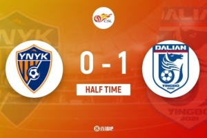 傷停補(bǔ)時(shí)3分鐘。上半場(chǎng)比賽結(jié)束,云南玉昆0-1大連英博。