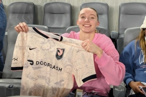 在比賽間隙,佩奇還獲贈(zèng)了天使城足球?yàn)槠涠ㄖ频那蛞?。而在賽后華盛頓精神隊(duì)球員Croix Bethune(上賽季最佳新秀的)、Trinity Rodman紛紛找到佩奇并合影。