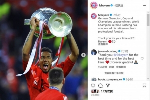 拜仁官方社媒曬出博阿滕效力球隊(duì)期間捧起歐冠獎(jiǎng)杯的照片,并寫道:“德甲冠軍、德國杯冠軍、歐冠冠軍、世界冠軍,博阿滕已經(jīng)宣布退役。感謝你在拜仁的時(shí)光!”