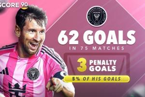 梅西:邁阿密國際75場(chǎng)62球,3點(diǎn)球,占比5%