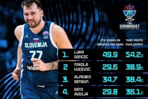 體育資訊9月21日訊 歐錦賽官方發(fā)布了本次賽事得分+助攻得分占全隊(duì)總分比重的前十,具體如下: