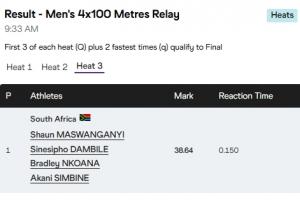 體育資訊09月21日訊 2025年東京田徑世錦賽,男子4x100米接力預賽重賽,南非隊跑出38秒64,未能達到38秒34的晉級線,無緣今晚進行的決賽。