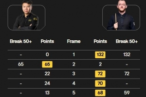 艾倫在上半場以3-1的比分進入中場休息,又一度以5-1拉開比分優(yōu)勢,第七局周躍龍單桿81分扳回一局,第八局艾倫幾度上手完成超分,目前艾倫6-2領(lǐng)先周躍龍結(jié)束第一階段。