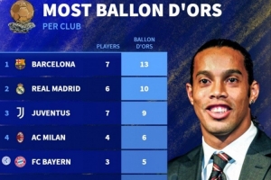 體育資訊9月22日訊 德國轉(zhuǎn)會市場統(tǒng)計了各個俱樂部和球員贏得金球獎的次數(shù),并列出榜單。其中巴薩7人13次居首,皇馬6人10次第二,尤文圖斯7人9次排名第三。