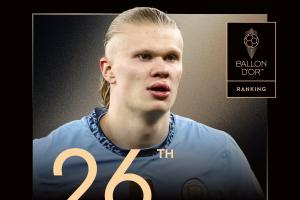 曼城前鋒哈蘭德排名第26名,這是他第五次獲得提名。