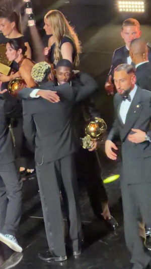 體育資訊09月23日訊 2025年金球獎(jiǎng),登貝萊加冕榮譽(yù)?,F(xiàn)場(chǎng)儀式結(jié)束后,亞馬爾等待在一旁,祝賀并擁抱了登貝萊。