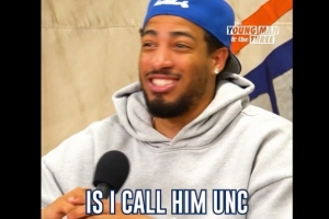 主持人在引導(dǎo)問題的時候,另外一位嘉賓斯派克-李插話到:“庫里多少歲了?”哈利伯頓笑著說:“我不知道,我只知道我叫他叔叔(uncle),我不知道他多少歲。他可能36、35還是37?”