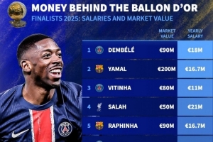 體育資訊9月23日訊 德國轉(zhuǎn)會(huì)市場盤點(diǎn)了2025年金球獎(jiǎng)排名前10球員的年薪,姆巴佩3130萬歐居首,金球獎(jiǎng)得主登貝萊1800萬歐。