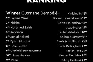 體育資訊09月23日訊 登貝萊奪得2025金球獎(jiǎng),隊(duì)報(bào)報(bào)道,周六《法國(guó)足球》雜志發(fā)布時(shí)將公布完整得分。