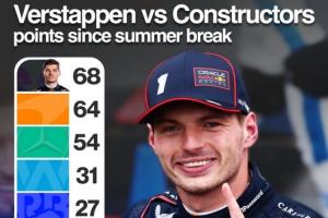 體育資訊09月23日訊 F1阿塞拜疆大獎賽,維斯塔潘桿位奪冠。據(jù)Sundaram R統(tǒng)計,維斯塔潘夏休期后一個人拿的分?jǐn)?shù)比其它任何車隊拿到的都多。