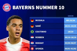 體育資訊7月1日訊 拜仁官方宣布,穆西亞拉將在世俱杯之后改穿10號(hào)球衣,德國(guó)轉(zhuǎn)會(huì)市場(chǎng)列出了拜仁的10號(hào)球員。