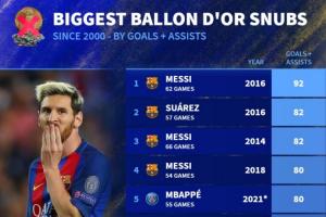 體育資訊09月24日訊 德國轉(zhuǎn)會市場盤點(diǎn)了各年份金球獎數(shù)據(jù),排出了對應(yīng)年份中無緣金球獎的最高進(jìn)球+助攻數(shù)據(jù)。以下是詳細(xì)排名。