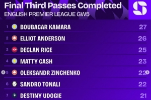 英超第5輪進(jìn)攻三區(qū)完成傳球排行: