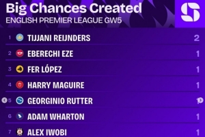 英超第5輪創(chuàng)重大機會榜: