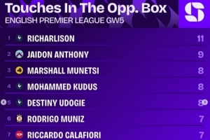 體育資訊9月24日訊 英超第5輪戰(zhàn)罷,squawkafootball列各項數(shù)據(jù)排行,熱刺前鋒理查利森是本輪在對方禁區(qū)觸球最多的球員,共11次。