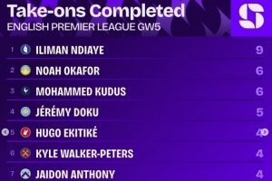 體育資訊9月24日訊 英超第5輪戰(zhàn)罷,squawkafootball列各項數(shù)據(jù)排行,埃弗頓邊鋒恩迪亞耶是完成過人最多的球員,共9次。