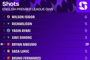 體育資訊9月24日訊 英超第5輪戰(zhàn)罷,squawkafootball列各項(xiàng)數(shù)據(jù)排行,桑德蘭前鋒伊西多是本輪射門(mén)次數(shù)最多的球員,共6次。